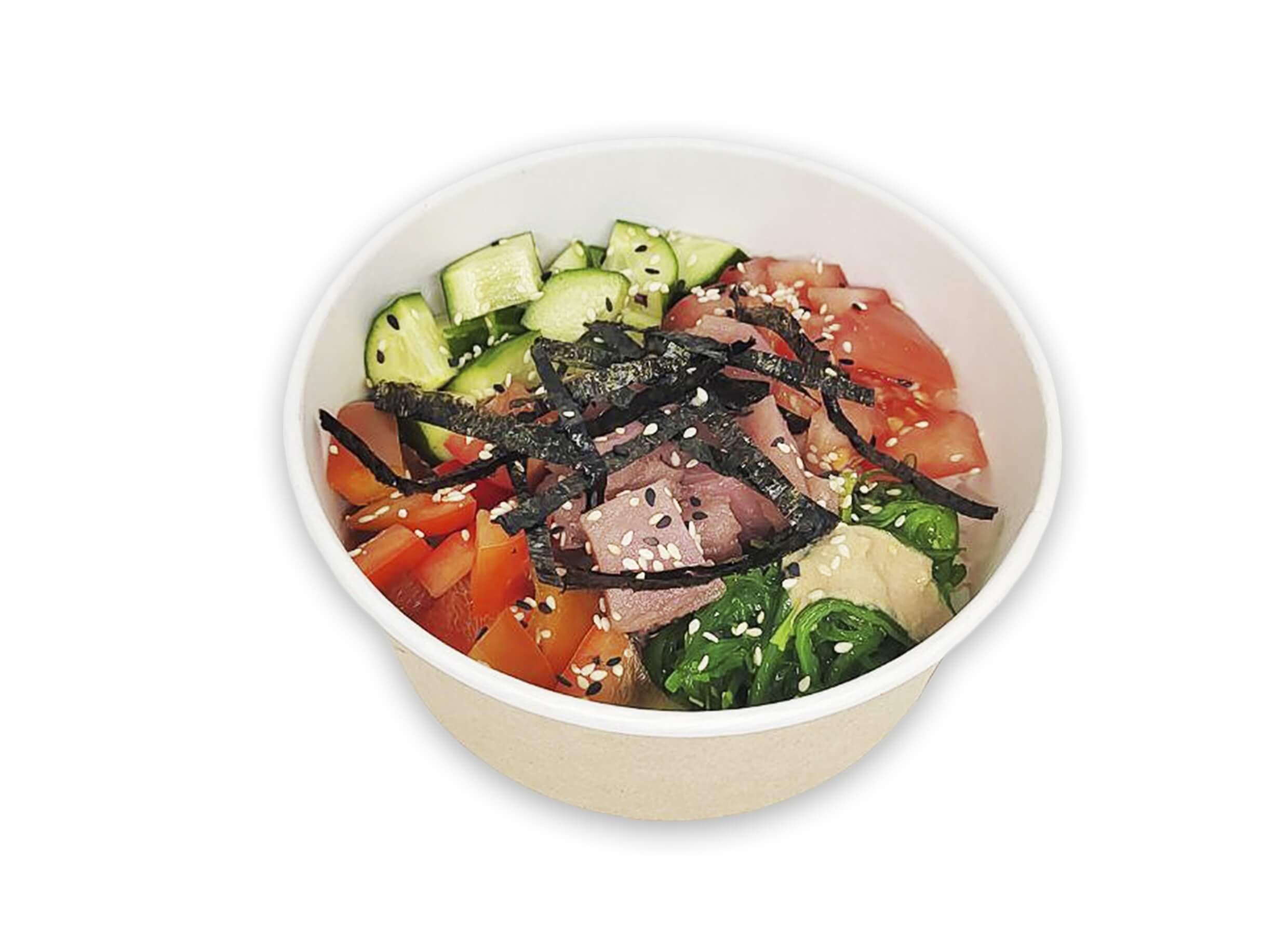 рис,тунец,огурец,помидор,перец болг,салат чука,соус для поке