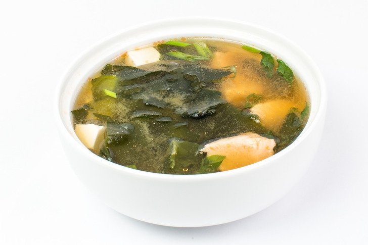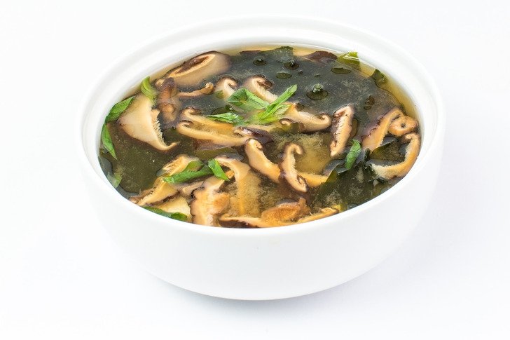 мисо бульон с соевым творогом, грибами шитаке и морскими водорослями