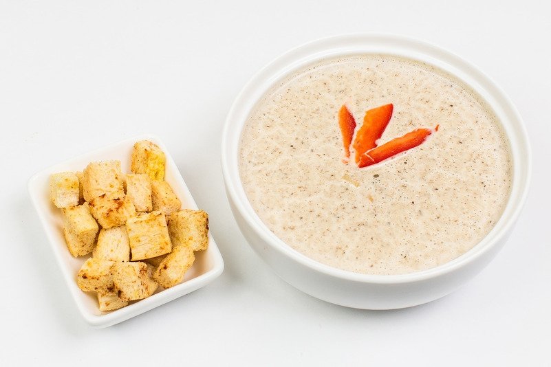 Оовощьной бульон, картофель, морковь, лук, чсесмнок, сливки, сливочный сыр, зелень, гренки